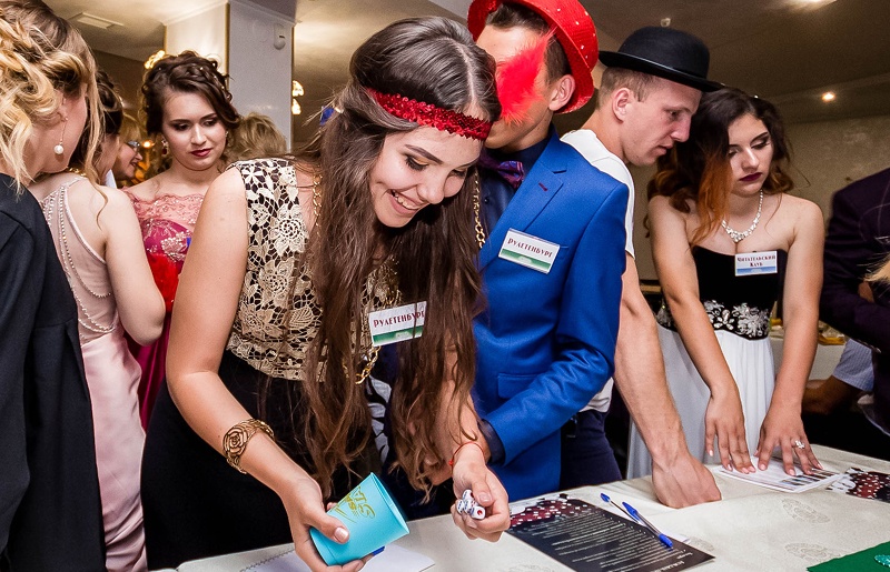 На игре выпускников встречают ведущие — уже в стилистике квеста. Они настраивают на нужный лад, раздают знаменитые гангстерские шляпы, вуалетки и другие тематические аксессуары всем желающим. Ребят делят на команды и каждой достается своя уникальная легенда. Теперь им придется постараться, чтобы добится целей!