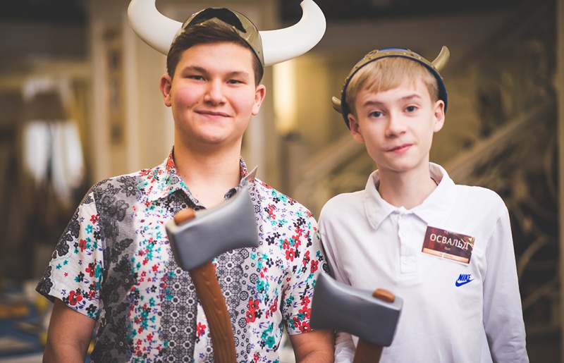 Игра начинается с преображения. Ведущий раздаёт тематический реквизит и элементы костюмов. Короны и мантии, венцы, викингские топоры, загадочные амулеты — все это мы припасли для игроков «Ночи в Музее».